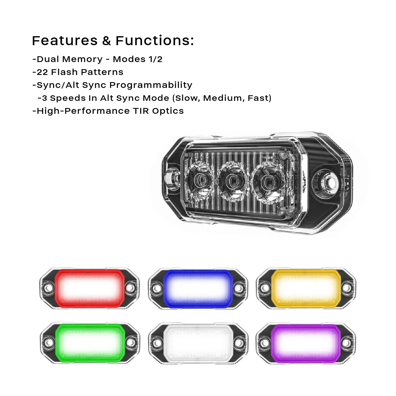 The Z-3® TIR LED Surface Mount is the smallest member of the SpeedTech Lights Z® Series family. The unit houses 3 Eclipse® TIR optics in its super compact and durable casing. An upgrade from our previous generation technology, the MaxGen® Z-3® TIR LED Surface Mount is extremely bright and powerful with a larger optic to enhance the brightness even more.Every unit comes in your choice of Red, Blue, Clear, Green, or Amber and with a variety of unique flash patterns (see video). The Z-3®’s easy install design gives you the flexibility to mount it anywhere on your vehicle’s exterior surface or grille.