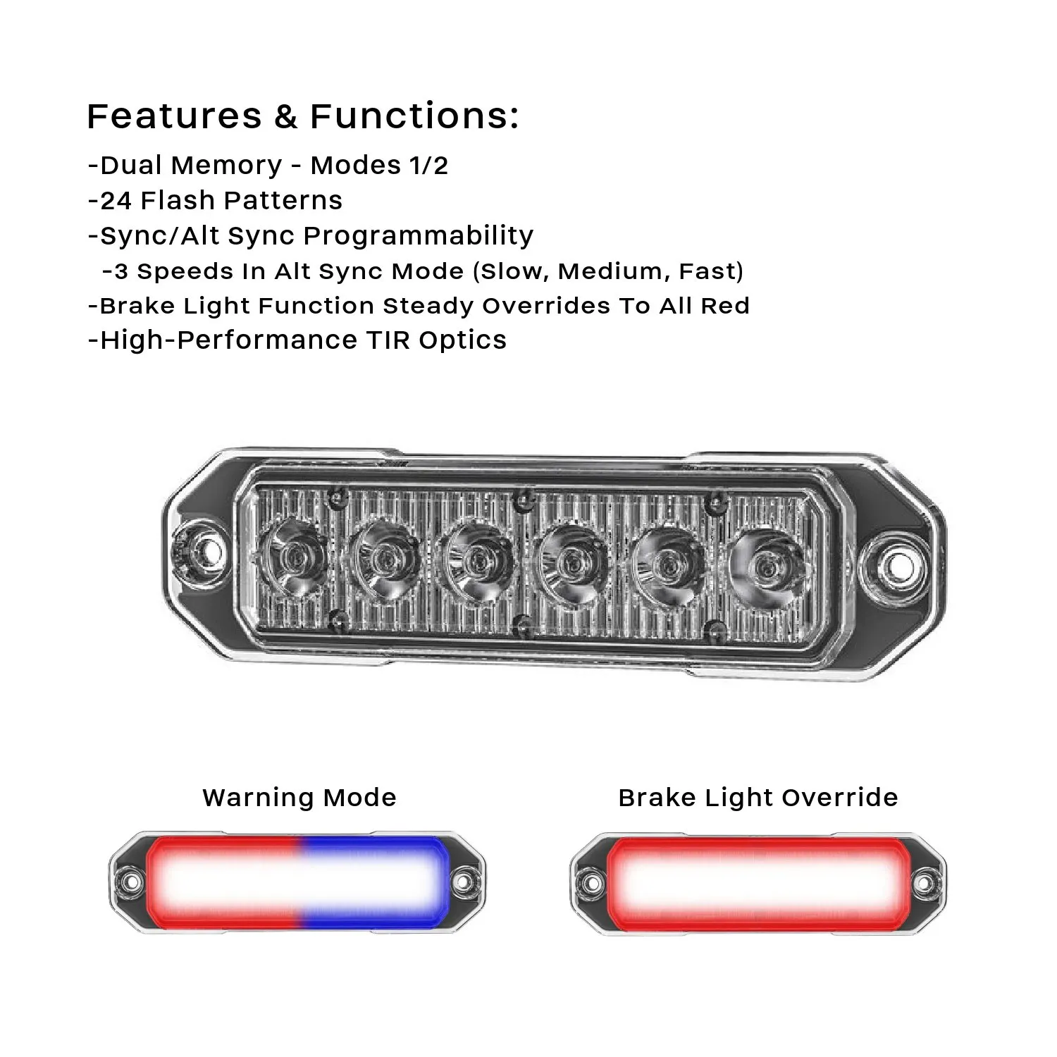 - BRAKE LIGHT (secondary RED) functionality switches to all red LEDs when Brake Light mode is activated for extreme illumination