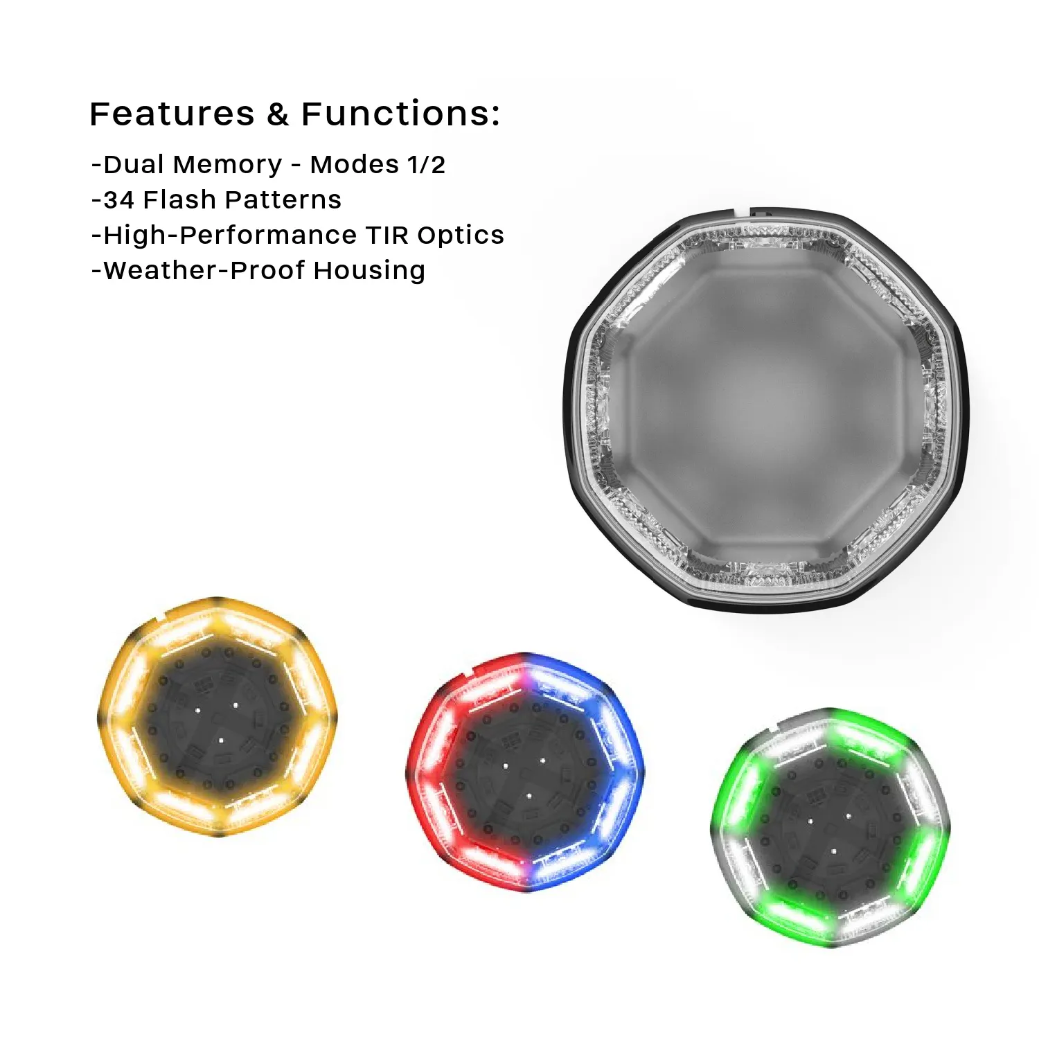 The Dual Memory Octo® Mini LED Beacon from SpeedTech Lights is one of our most popular mini beacons we carry. With 24 MaxGen® intense 3-watt LEDs totaling 72-watts of output, it's hard to find a brighter beacon light on the market. Each unit also comes equipped with 30 flash patterns as well as dual memory modes so you can program up to 2 different patterns for a quick switch back between memory 1 and memory 2.The Eclipse® Technology TIR optics built in this unit which cover each LED individually give it a more enhanced flash per module making this Octo® visible from very far distances.