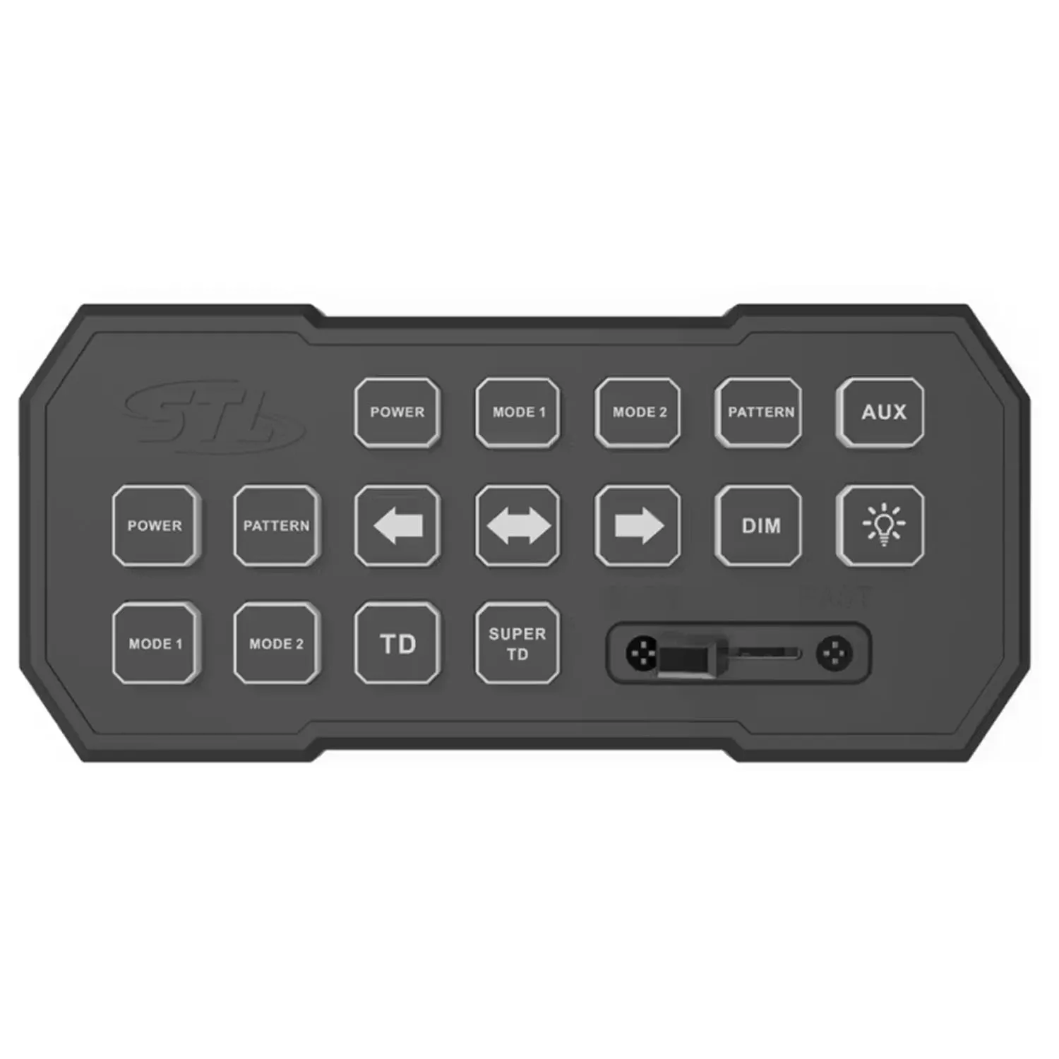 The Super Take Down GranDirect Vehicle Control Switch Box from SpeedTech Lights is a hybrid light bar control box. It takes the STL Super TD Grand Control Box and the STL Direct Control Box and merges them into one controller. This control box has 2 connectors, one connector on each end for products that utilize the Super TD Grand or Direct Control.This is the perfect switch box for any one purchasing a STL product that utilizes the STL Super Take Down Grand Control Box and a product that utilizes the STL Direct Control Switch Box because it allows you to hook everything up to one switch box controller rather than clutter up your console with multiple switch boxes. It gives you the full functions of both switch boxes so you can control your super take down visor light bar, or traffic advisor light bar using the multiple mode buttons for dual memory, change your flash patterns, your traffic advisor patterns, directional modes, the speed of the flash patterns, and of course power units on and off. It also includes an AUX button on the direct control side so you can even connect other LED warning lights to this controller.