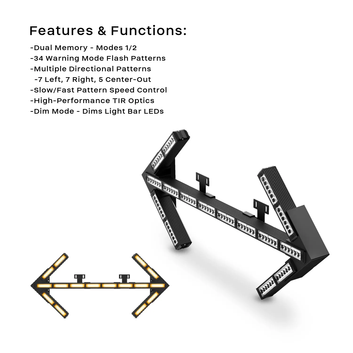 The Dart® Elite TIR Exterior LED Traffic Advisor Arrow Stick is one of SpeedTech Lights’ most unique products. It uses the Striker Series dash lights to combine into a full traffic arrow units. Specifically designed for construction and traffic advising purposes, we’ve packed 96 of our patented Eclipse® Optic TIR 3-watt LEDs onto the arrow shaped frame.With 288 watts of power and the choice of multiple flash patterns, the Dart® Elite TIR Exterior Arrow Stick is truly one of a kind. 33” in length, 16” in height, the Dart® is compact enough to fit any vehicle, but bright enough to lead the fleet. With the new dual memory modes, you can program up to 2 different patterns for a quick switch back and forth between memory 1 and memory 2 using the mode button(s).