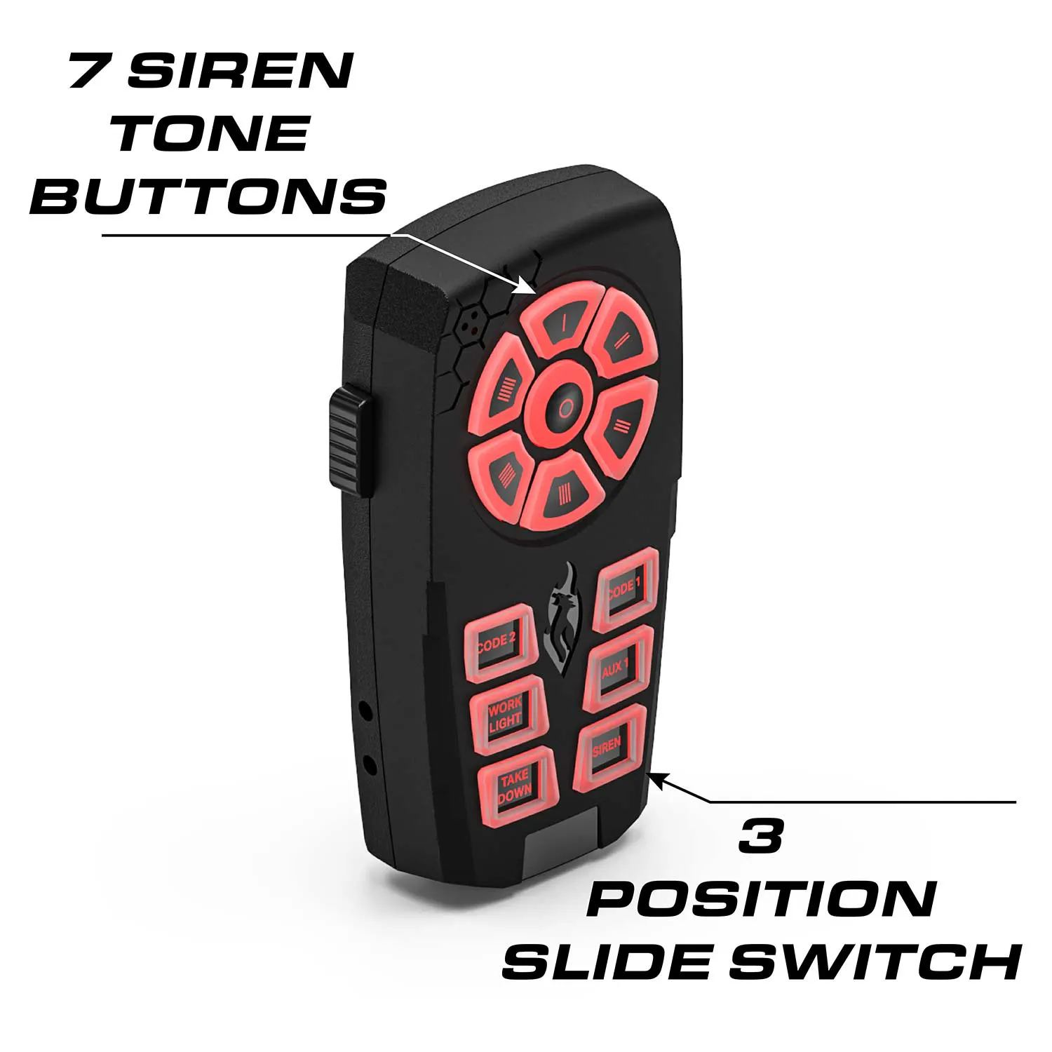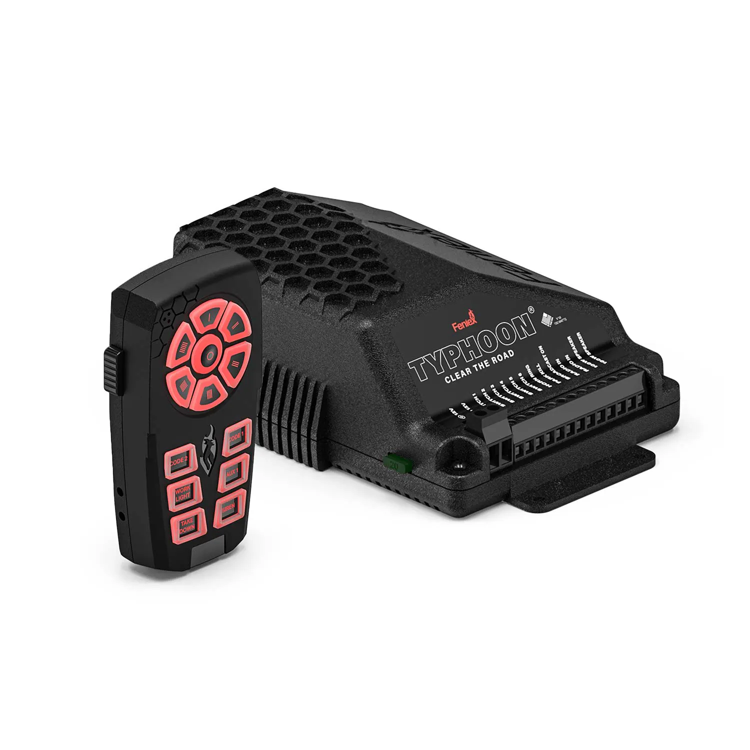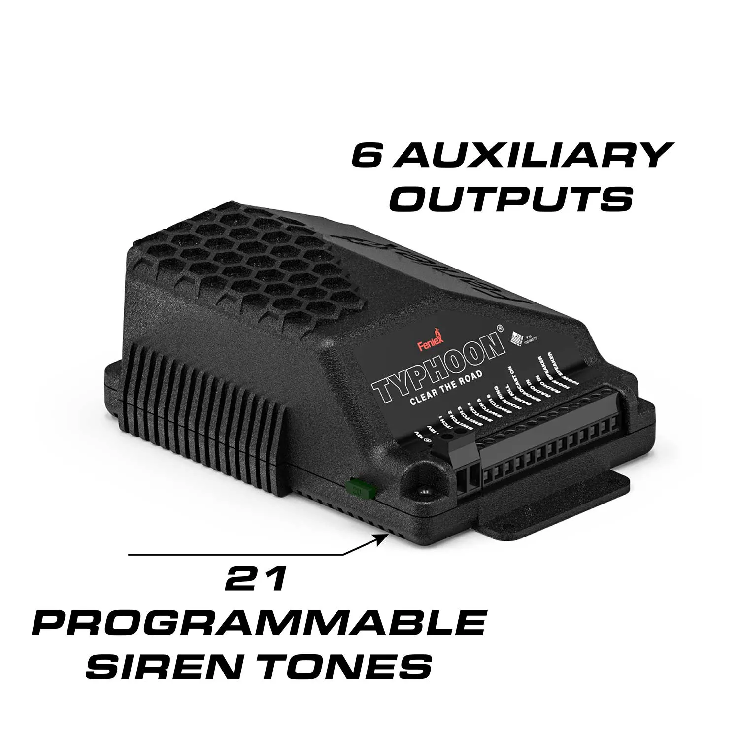 The Feniex Typhoon Handheld Siren is a compact, all-in-one 100-watt siren and vehicle lighting controller designed to simplify your vehicle's warning system. The Handheld Typhoon Siren is a fully integrated siren system featuring seven tone selection buttons and six programmable outputs for external lighting built into the handheld controller. The handheld siren controller also functions as a PA microphone.Ideal for professionals and POV vehicles, the Full-Function Handheld Feniex Typhoon Siren provides essential siren and lighting control without the complexity or excess outputs found in more complex all-in-one controllers. The amplifier is compact and can easily be tucked away in your vehicle for a clean and discreet install.