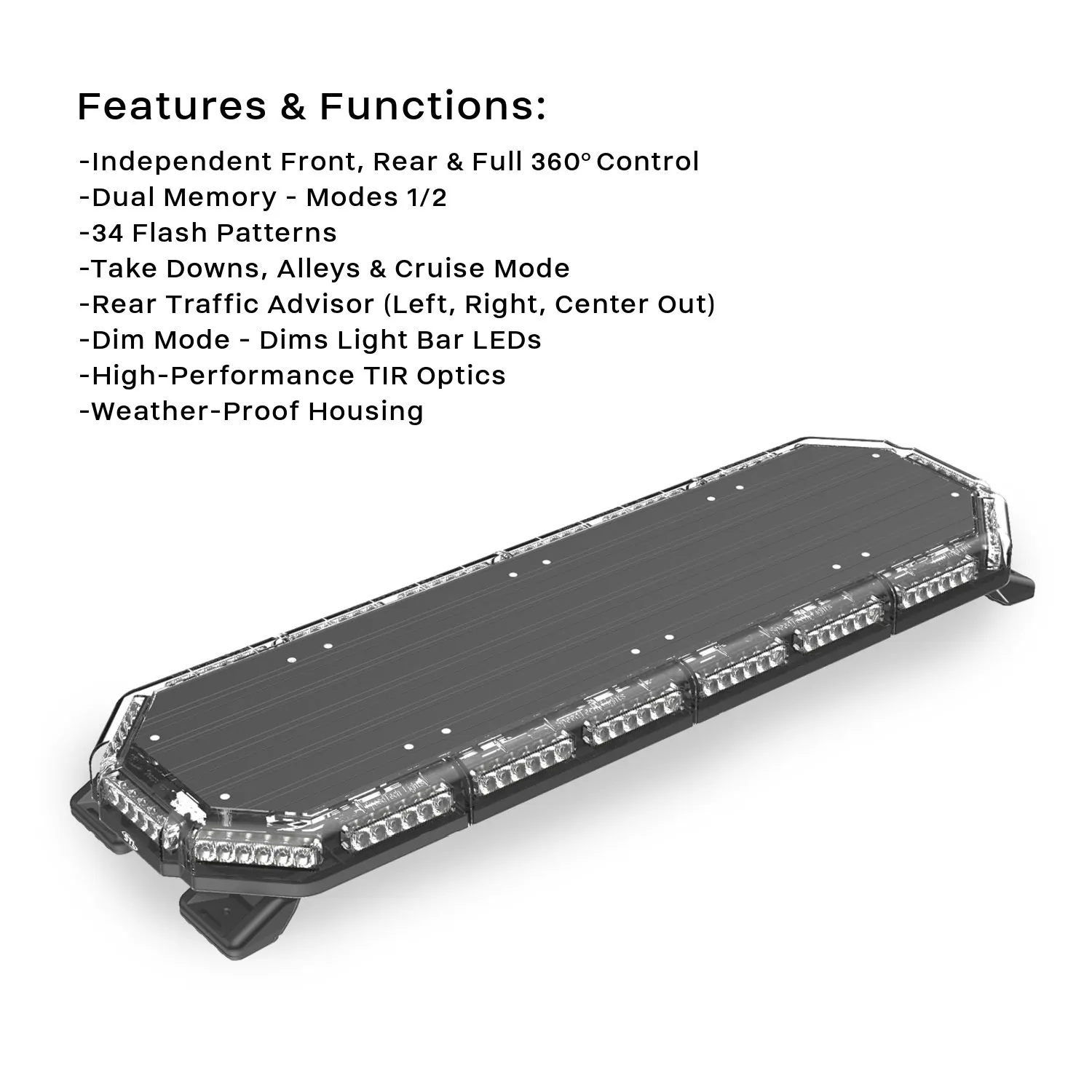 The smallest LED light bar in the SpeedTech Lights “full sized” category, the K-Force® Elite 36 TIR LED Light Bar was redesigned with durability, functionality, and affordability in mind. Packed with 108 MaxGen 3-Watt LEDs, this Elite model 36 emergency light bar combines innovative LED technology and a polycarbonate, anodized aluminum hybrid housing into one impressive unit.In the emergency lighting business, reliability is key. That’s why at SpeedTech Lights we work day after day to build trust through SAE J845 Certification, 5 year Warranties, and 5 Star Customer Service and providing the highest quality, most affordable products on the market. With the new dual memory modes, you can program up to 2 different patterns for a quick switch back and forth between memory 1 and memory 2 using the mode button(s). This bar also features dim mode so you can dim the light bar when necessary.