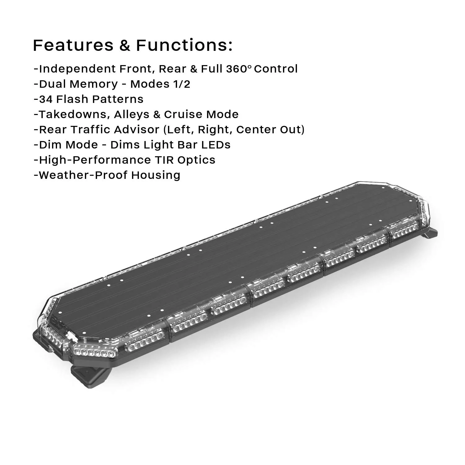 The K-Force® Elite 47 TIR Full Size Light Bar from SpeedTech Lights is one of our most popular emergency vehicle warning light bars we carry. Whether you're using this as a police light bar, tow truck light bar, or any other emergency vehicle lightbar, it has all the features you need to control traffic and command the attention of drivers on the road.Unlike competitors, you don’t have to pay more for the features you need to get the job done. Every full sized K-Force® Light Bar comes standard with a 6 module amber traffic advisor, independent cruise mode, 34 flash patterns, takedown lights, alley lights, and no wasted space. Packed with 132 3-Watt MaxGen® LEDs, the K-Force® Elite 47 TIR Light bar is built to perform at the highest level for a fraction of the price. With the new dual memory modes, you can program up to 2 different patterns for a quick switch back and forth between memory 1 and memory 2 using the mode button(s). This bar also features dim mode so you can dim the light bar when necessary.