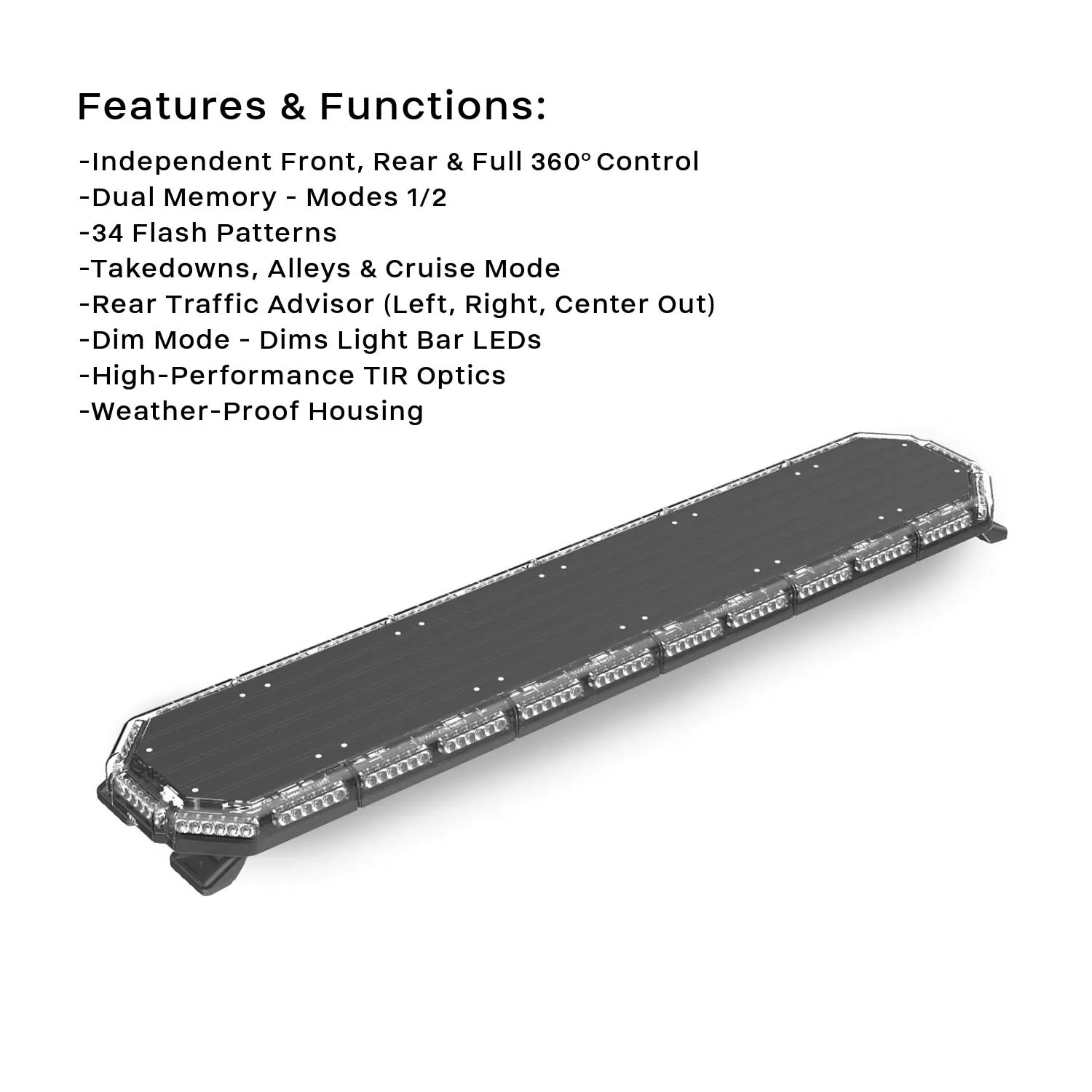 The redesigned K-Force® Elite 55 TIR LED Full Size Light Bar from SpeedTech Lights is the perfect way to bring high visibility, 360-degree warning light power to large vehicle applications. Now built with efficient LEDs, the K-Force® Elite 55 TIR makes the most of the 3-watt power coursing through each of its 156 MaxGen LEDs to produce a pure light output with the least possible amp draw.Whether you’re looking to illuminate a construction site with the independent control front takedown lights, or direct roadside traffic at the scene of an accident, this Elite 55 LED light bar is packed with the functionality you need to get the job done. Ruggedly built with a new aluminum/polycarbonate hybrid housing, the new K-Force® Elite 55 TIR LED Light Bar was engineered to work just as hard as the people behind the control box. With the new dual memory modes, you can program up to 2 different patterns for a quick switch back and forth between memory 1 and memory 2 using the mode button(s). This bar also features dim mode so you can dim the light bar when necessary.