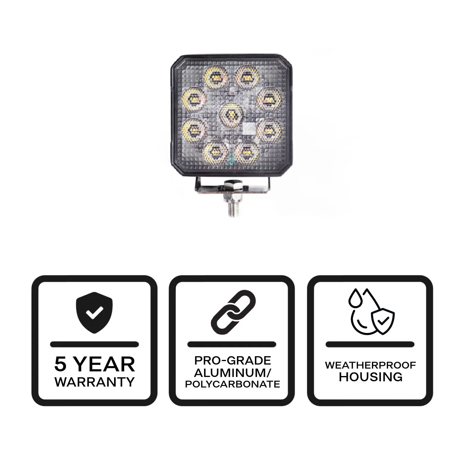 The Flash Quad Carbine-18® Dual Color 4" Square Off Road LED Flood/Work Light from SpeedTech Lights features a total of 18 powerful LEDs providing two separate types of functionality. This unit features an all-white steady burn floodlight mode and a flashing amber mode with one singular blinking pattern. Get the best of both worlds and use this dual color square LED work light as both an illumination product or warning product. Check out the product video to see these functions in use. Get two in one with this awesome product.With 9 of the 18 LEDs being utilitized for floodlight functionality and perfectly utilized optics to enhance the brightness, the all-white steady mode is sure to light up the scene whether being used for work or off road lighting. This model outputs a 120 degree wide flood beam for extreme illumination. The 9 floodlight LEDs are rated at 5-watts per LED while the 9 warning LEDs are rated at 1-watt per LED. This unit also has a lumen output of 2200-4000 lm making this product just an all around power house.