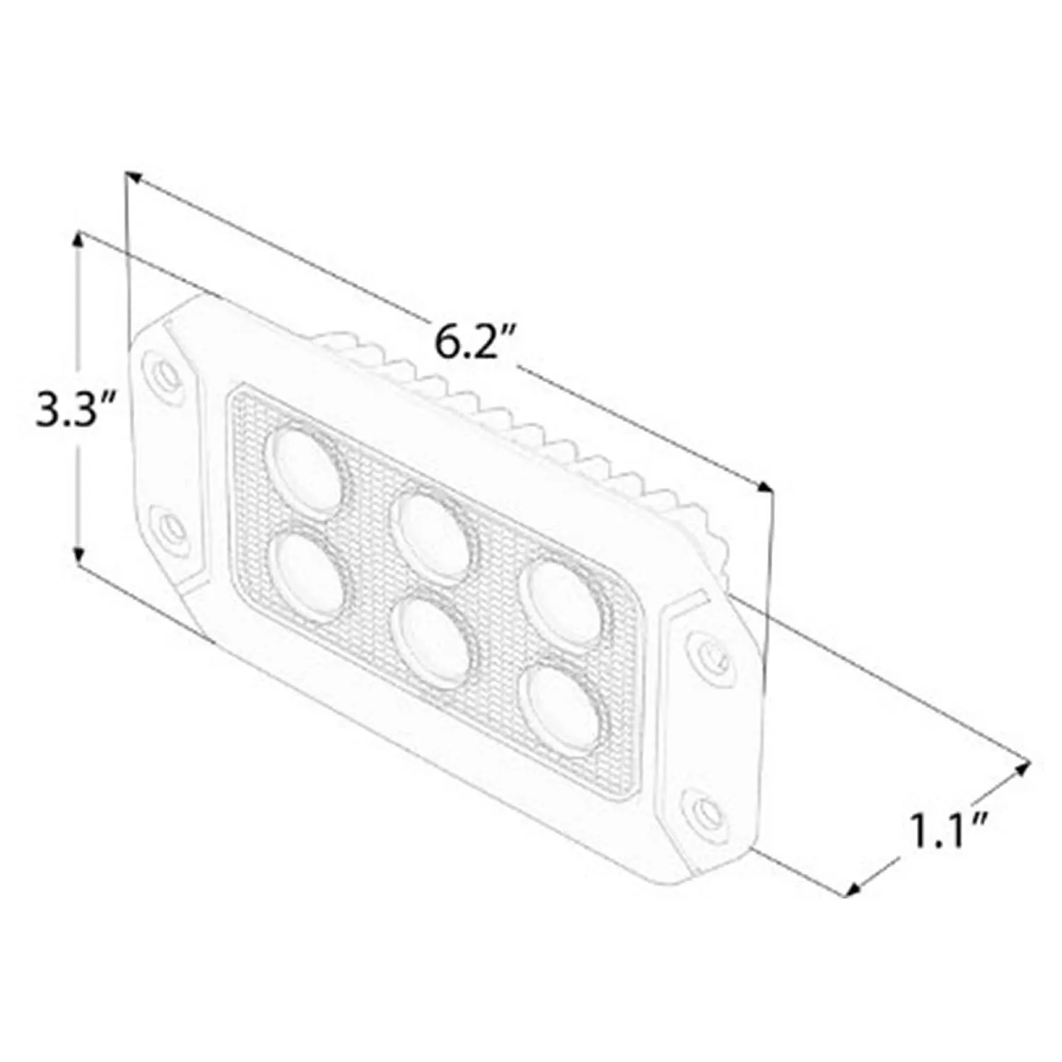 The Hex Carbine® 6” Rectangular Flush Mount Off Road LED Light from SpeedTech Lights is a super compact LED driving light and work light with a 1,140 Lumen output. With a 6” housing designed to be used as a flush mount work light, this unit has pre drilled holes to make installation simple and professional and blend perfectly with your vehicle. The beam provides a wide angle spread for ample lighting for a variety of off road lighting applications.This unit features 6 powerful 1.5 watt LEDs with a total light output of 9 watts and draws little power being that it uses high quality LED technology. Regardless of if you’re looking for a rectangular LED work light, off road flush mount light, or LED driving light, this unit will fit your needs and exceed all expectations.