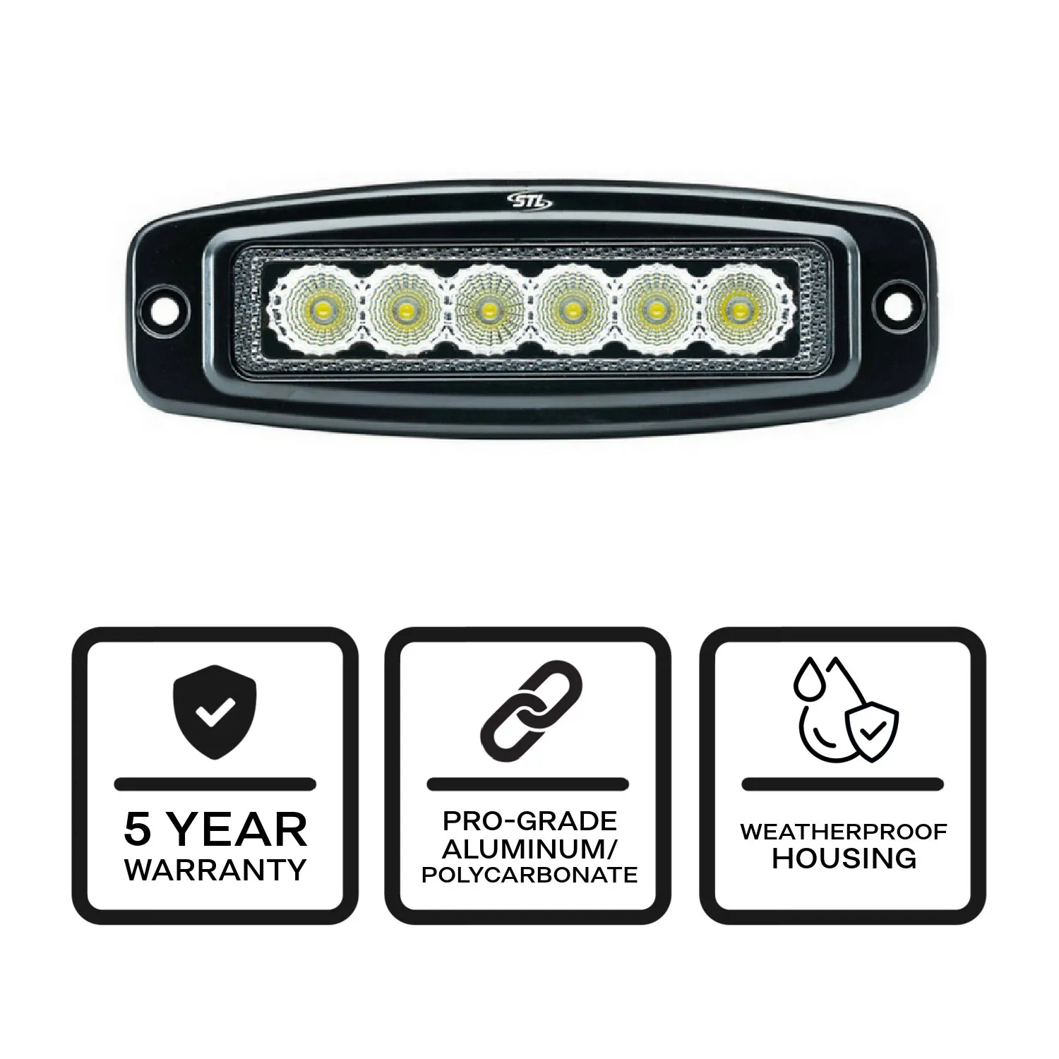 The Carbine-Z® 7.5” Rectangular Flush Mount Off Road LED Work Light comes equipped with flood light optics outputting a 90 degree flood beam spread with 1,620 lumens of bright white light output. With 6 LEDs rated at 3-watts per LED, this unit provides ample lighting at night for your off road vehicle lighting needs.This unit also makes a great LED work light. With its flush mount capability, once installed it looks like a LED surface mount work light. Built in screw holes make installation simple and very professional. With is compact housing and flush mount concept, the unit is extremely low profile.