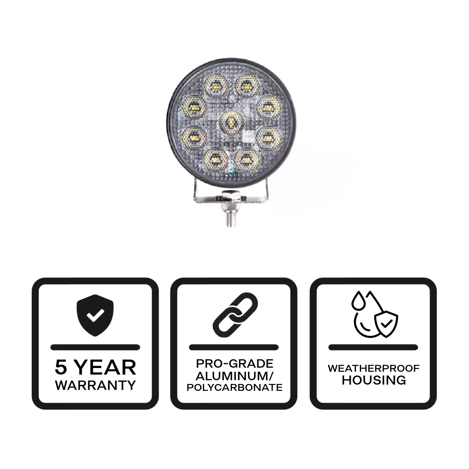 The Flash Circle Carbine-18® Dual Color 4.25" Round Off Road LED Flood/Work Light from SpeedTech Lights features a total of 18 powerful LEDs providing two separate types of functionality. This unit features an all-white steady burn floodlight mode and a flashing amber mode with one singular blinking pattern. Get the best of both worlds and use this dual color circle LED work light as both an illumination product or warning product.With 9 of the 18 LEDs from this unit being utilized for floodlight functionality, this unit has an extremely bright output with a 120 degree wide flood beam for extreme illumination. The 9 floodlight LEDs are rated at 5-watts per LED while the 9 warning LEDs are rated at 1-watt per LED. This unit also has a lumen output of 2200-4000 lm making this product just an all around power house.