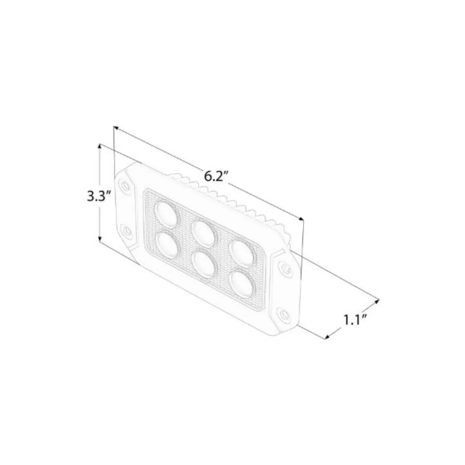The Hex Carbine® 6” Rectangular Flush Mount Off Road LED Floodlight from SpeedTech Lights is a super compact LED driving light and work light with a 1,140 Lumen output. With a 6” housing designed to be used as a flush mount work light, this unit has pre drilled holes to make installation simple and professional and blend perfectly with your vehicle. The floodlight beam provides a 60 degree spread for ample lighting for a variety of off road lighting applications.This unit features 6 powerful 1.5 watt LEDs with a total light output of 9 watts and draws little power being that it uses high quality LED technology. Regardless of if you’re looking for a rectangular LED work light, off road flush mount light, or LED driving light, this unit will fit your needs and exceed all expectations.