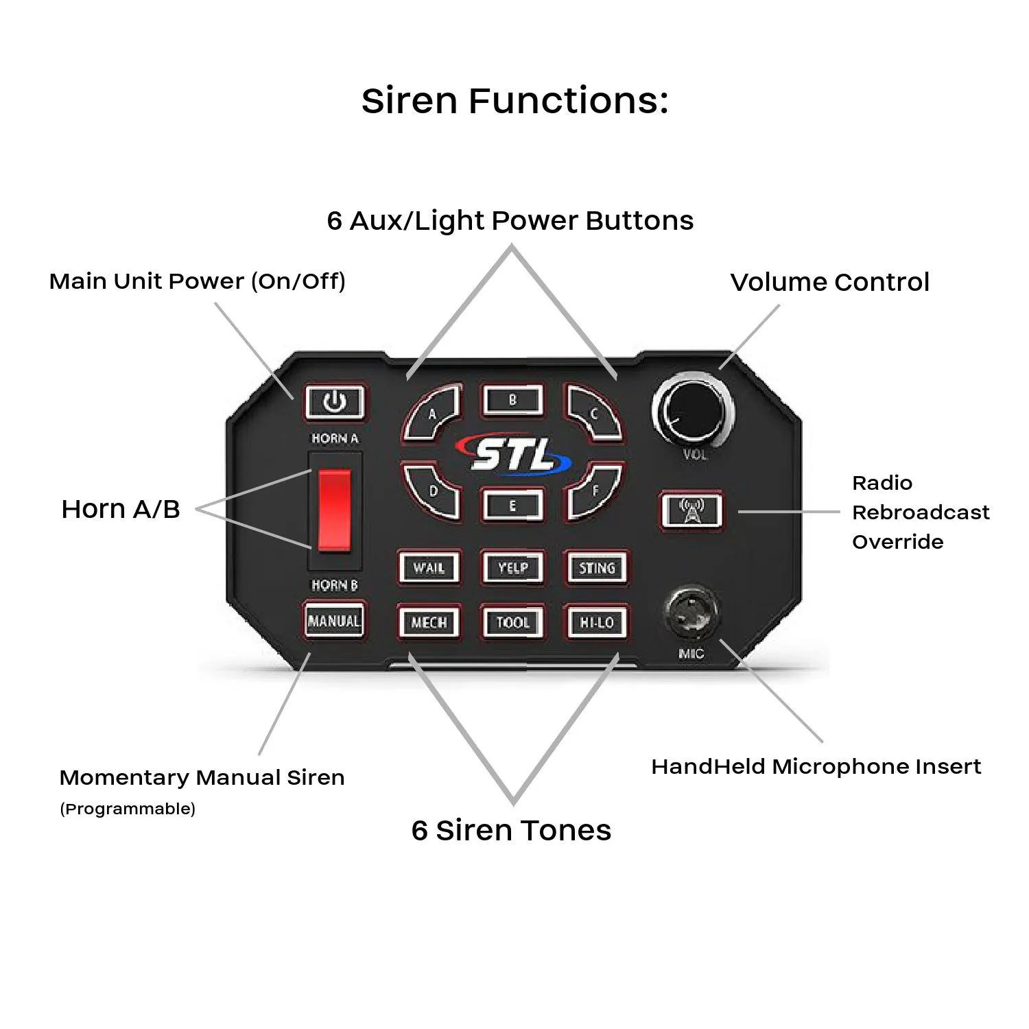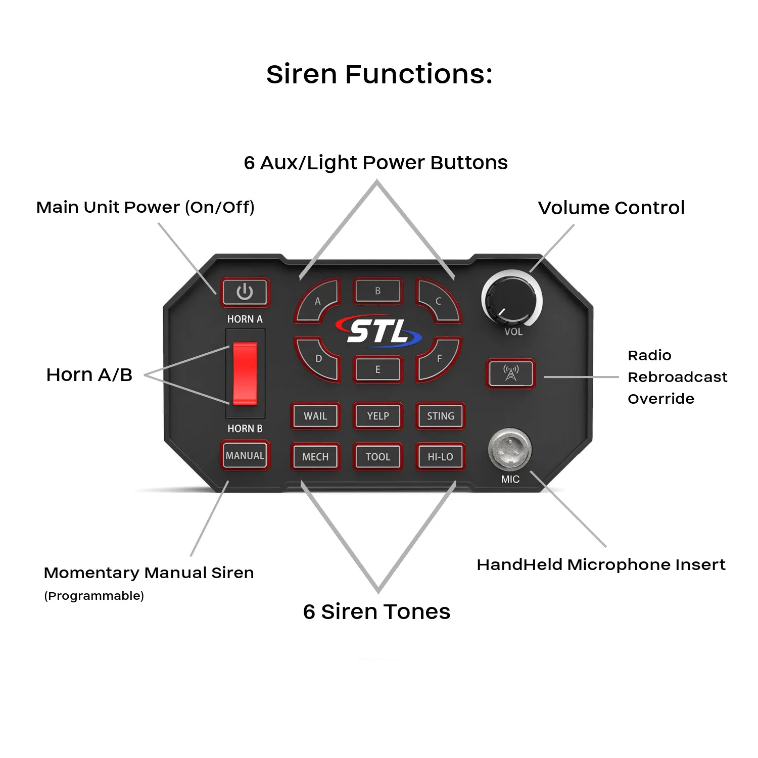 - Independent siren tones for easy selection